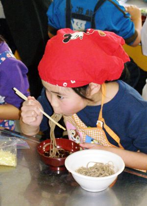 短く切れずに長くつながった蕎麦に、自信を持った様子でした。皆さんとても上手でした。将来の蕎麦打ち職人を期待しています。