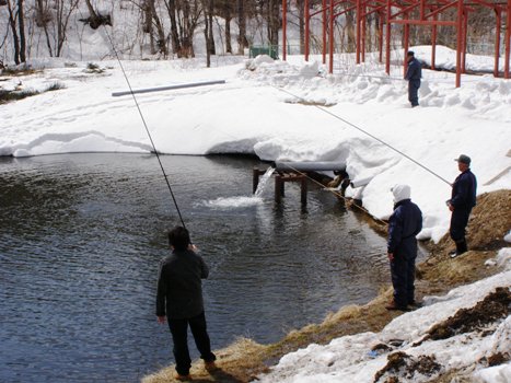 この釣堀もご他聞に漏れず雪解けが遅く1面のみのオープンとなりましたが、30センチ超のにじますが釣り上げられていました。