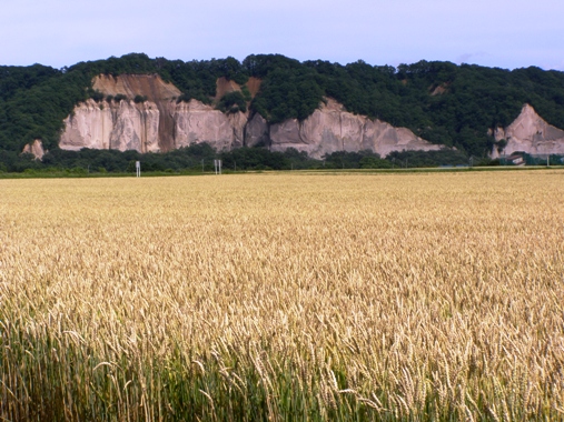 崖の手前の黄金色は、収穫時期を間近に迎えた秋蒔き小麦です。もうすぐ大型コンバインが活躍します。
