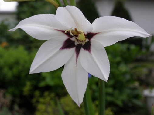 「アキダンセラ」エチオピア原産のアヤメ科の植物で、グラジオラスに近い種類だそうです。変った花にひかれて買ったのでした。5株植えたのですが、今のところ1株に花が付きました。