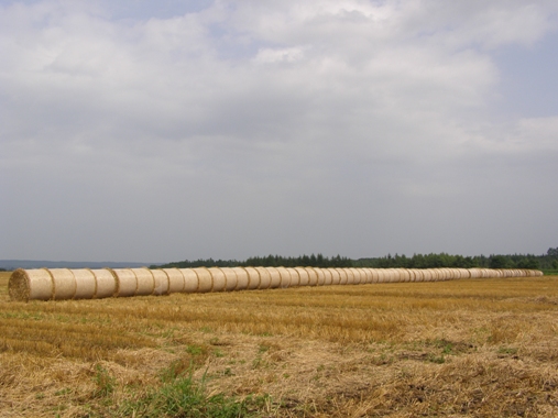 大型コンバインで収穫される小麦は、実と茎葉を自動的に分けられ、実はコンバインのタンクへ、そして茎葉は畑に残されます。畑に残された茎葉は、牧草を丸めるロールベーラーという大型機械で牧草と同じようなロールにまとめられます。このロールは1個700キログラムもあるんですよ。このロールは飼料としてではなく、牛舎の寝藁などに使われます。