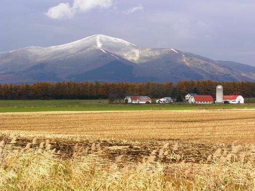 佐幌岳の山腹は、サホロリゾートスキー場が広がり、コースの一部が白くなっています。頂上直下にはゴンドラの山頂ステーションが望めます。