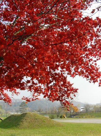 帰り道見つけたのがこの紅葉、普段気がつかなかったのですが、今年見かけた紅葉の中で一番の色合いを見せていました。場所は、古墳ではありません、幼稚園の園庭です。