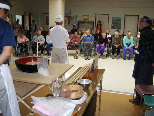 一年に一度お邪魔するだけのわれわれを利用者の方々は待っていてくれました。顔なじみの方もいて、早速手打ちの開始です。