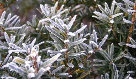 庭のオンコ(いちい)の木も霜の華が咲き寒そうです>