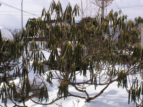庭の石楠花の木も葉を丸め表面積を小さくして寒さにじっと耐えています。葉を丸めるとは寒さに耐える知恵なんですね。蕾も固いままじっと春を待っています。この寒さに耐えて綺麗な花を咲かせてくれるのです。
