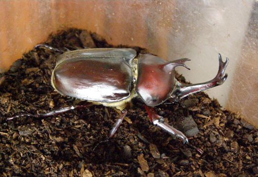 (こちら)のとおりですが、羽化したカブトムシは、オスが2匹・メスが3匹でした。飼育箱に入れ観察していましたが、交尾したことを確認できたので雌雄別々に飼育することにしました。(近所の M さんからメスを分けてもらったのでメスも3匹。) オスは3匹とも飼育箱に、メスは1匹づつ特製の飼育ビンに移し、産卵を待っているところです。
