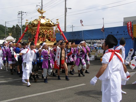 前日の宵宮では、夜店のほか、恒例の綱引き大会も行われました。各地域から力自慢の若者達がチームを作って出場、男女に分かれて優勝を競いました。応援にも力が入ります。