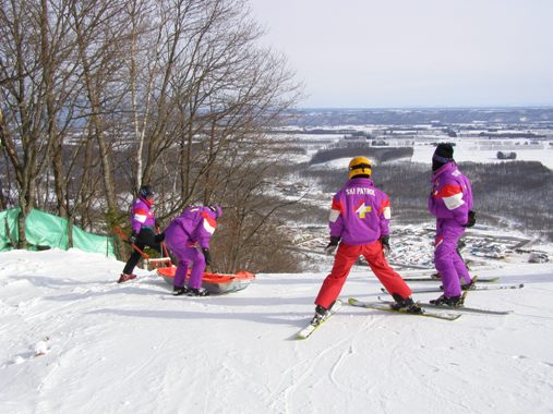 昨日は、新得スキー連盟安全対策部のスキーパトロール隊員が、頂上から負傷者を「アキヤボート」というソリに収容して搬送する技術を研修しました。