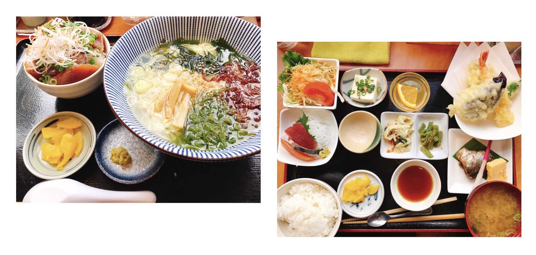 Aランチ鮪漬け丼と磯ラーメン(1000円) と 江釣子屋定食(950円)