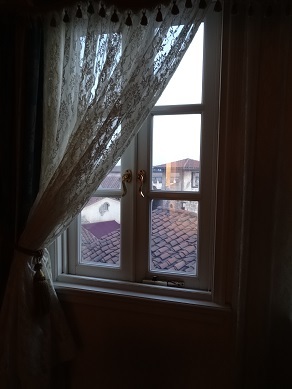窓の外には異国の街並み・・・夜が明けて白くなる街並み・・・天気予報ではくもりだったが朝日が昇ってきて街がオレンジ色に染まってくすごく、きれい♪今日は、わたしの誕生日