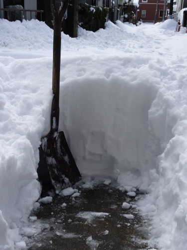 南に開けたところにある我が家雪が吹き込んできてるのか50センチ以上雪が積もってる・・・・やっと道路の際まで掘り進めたけど腕痛い~、太もも痛い~~絶対明日筋肉痛だ・・・こんな道路なのに無謀にも車が入ってきたタイヤが空回るなんて問題じゃなくて走ってくると雪を押してきて自らの車の前に雪の壁ができてしまって身動きができなくなってる道路の横にはもっと雪だまりがあるから突っ込めば動けない運転してるのは近所のワンコ先生病院に出勤するために来たらしい近所のみんなで先生の車を動かすべく除雪結局、家の前の道路を丸ごと人力除雪することになってしまった前のおばさんは玄関前に雪が積もって扉が開かず閉じ込められてた日本の玄関は外開きだからこんな問題も起こるんだなそれにしても、すごい雪だ45年間の雪より明らかにすごいな