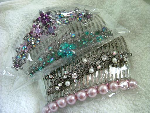 闇福袋(Lサイズコーム)、届きました!もう買わない・・そういいながら、つい買ってしまった闇袋。でも中身は、ご覧の通り、なかなか良いです。一番上のはカクテルのアメジスト、これ欲しかったんだ♪最近セールになって、気づいた時はアメジストは売り切れだった。まさかお取り置き中の福袋に入っていたとは。2番目のはブリア。しかも、やっぱり私の好みのカラー。ねいる屋さん、ありがとう!3番目のはパールやクリアの石がパラッと蒔かれたようなコーム。以前別の中身が見えてる福袋にはいっていたヤツで、実は私もすでに持ってます。でも、軽くて使いやすいんだよね。お友達にあげようかな。4番目のは、ピンクのパールと小さな石のついたコーム。・・・うーん、ピンクか・・・。でも、着物にあうかもしれないな。闇福袋は以上4点入っていました。これで3000円は、ワタシ的には大当たり!でした。で、次はお取り置きしていて、闇福袋と一緒に送ってもらったコームたち。一番上はずっとずっと欲しかったロイヤルリボンちゃん。その下3つはディーバ。リボンは形が甘いので黒だけ買ったの。で、クオリティの高そうなディーバ3つ買い。どれもキラキラ~☆ミ、もちろん夫にはナイショです(^-^;。自分のおこづかいで買ってるんだけど、あまりいい顔されないんだ。なんでかなー。