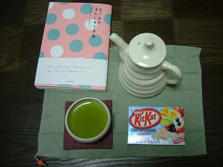 夜中は、赤ちゃんがまとめて眠ってくれるので、やっと一息できる時間です。というわけで、午前3:30(もう朝か?)ちょっと一服、お茶とお菓子となごみのまんじゅう手帖。ただまんじゅうがズラリ並んだだけ、ではありませぬ。そのまんじゅうの特徴別に、いっこずつがとても可愛らしく紹介されていて、まるで「さあどうぞ、めしあがれ」と言わんばかり。そして「こういう可愛いお菓子もあるよ♪」「こんな素敵な雑貨があったよ♪」「そうそう、このまんじゅうってば、包みもかわいいんだよ、ホラ!」って感じに、まるでお友達の家で寛いでいる時のおしゃべりのようにページがすすんでいきます。まんじゅうかるたがあったり、まんじゅう小物の作り方が載ってたり、まんじゅうの作り方も載ってる。乙女心をとってもくすぐられる内容なんだ。ひとりで読んでも楽しいし、誰かと読むとこんどは「これ食べたことあるよ!」って言えて、またたのしい。ちなみに、夫が数ページめくりながら「あ、これ最近食べた・・・あ、コレも食べた、最近」とぶつぶつ言ってました。夫の会社は実はおやつが充実しているらしいです。うーん、くやしい。だんなさんいいないいな、と言ったら、その数日後に会社でおやつに出たもみじまんじゅうを持って帰ってきてくれました。ところで、このお茶セットは実はコーヒーセットです(^^;)。退職のお祝いに職場の女の子一同からいただきました。勿体無くてたまにしか使えない~。お菓子は、キットカットの期間限定のやつ。近所のコンビニでラスト一個でした。なかなか好きな味でした。