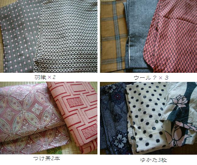 土曜日にひさしぶりに、着物やさんの倉庫市へ出かけました。(はじめて出かけたときの倉庫市の日記はこちら。)いつも倉庫市のときは、平気で2時間くらいかけて見ちゃうんだけど、今回は旦那とはるちゃんを車で待たせているので30分たらずで切り上げ、でもどっさり大量購入してきました。毎月第4週の土日月に開催されているのですが、今回は地域の「リビング」とかいう情報紙でも告知されていました。どんどんメジャーになってきた??羽織2点、ゆかた3点、帯2点など・・・渋目の羽織2つは、「もう羽織は山ほど持ってる」と思いながらも、ちっちゃな柄が可愛くて思わずカゴへ。左のはグレーと銀のチェックにピンクの四角もようです。右のも、黒い模様の中心にピンクの長丸が織り込んであります。ピンクが隠れてるアイテムに弱い私。着物は3枚、黄色(黄土色?)のチェックは綿のような、ウールのような???普段着に持ってこいなかんじ。真ん中の袷の着物も素材がよく分かりません。袖に傷アリですが、普段着だからいいかな。右の赤っぽいのはウールだと思います。柔らかくて厚手です。秋にいいかな♪つけ帯2本、どちらも赤系ですね~。洋服では赤っぽいのは絶対買わないのに、着物だと大好き。どっちも新品同様にキレイ。つけ帯ってやっぱり、人気無いの??私は大好きだけど(っていうか、普通の帯もつけ帯に自分で直してるし)。ゆかた3枚は、着ようと思って買ったのは一番左の紺色のもの。しぼがあってかわいい。真ん中のも白系でしぼがある生地で、模様もかわいいけど薄ーいシミアリ。着ようと思えば着られるかも・・・でも、ハギレと思って購入。一番左は薔薇模様。ハギレのつもりで買ったけど、可愛すぎる!寝巻きにしようかなー。以上、今回もカゴに入りきらないほど買ってきました。私だけだよ、こんな大量に買って行くの・・恥ずかしいよ・・。これでお会計は3000円からお釣りがきました。こんなに大量に買ったのに帰りがけに、私が迷って購入を諦めた羽織を試着している人を見かけて「ああ・・あれも買えば良かった」なんて思ってしまったり。物欲とどまるところを知らずですね(-_-;)。