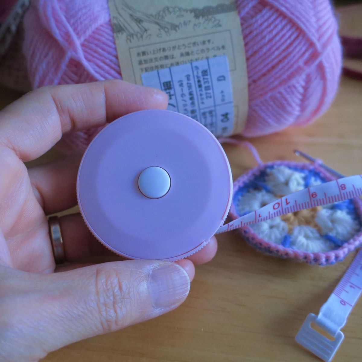 飽きもせず、メジャーカバーを編んでます。というか、メジャーを編みくるんでます。中細メリノウールを、かぎ針3号で編んだり、2号で編んでみたり。やっぱり、3号かぎ針できつめに編むのが、ダイソーのロータリーメジャーには一番フィットするみたい。一番時間がかかっているのは、メジャーの先の編みくるみ。どうしても、角が毛糸からはみ出ちゃうので、最後は、とじ針で毛糸を何度かくぐらせてカバーしてます。裏は毛糸がたるまないよう、キュッと綴じてます。そして、花びら8枚のアフリカンフラワーモチーフにもTRY。8枚の場合は、長編み5目×8と間の8目で、6枚の場合と同じ48目になるのですが、メジャーカバーとしては、少し緩めになりました。写真上側のは、ミカンとかオレンジっぽいのを目指したもの。配色がイマイチでした…(^_^;)メジャーのつまみもちょっと変えてみたり。夕方、またダイソーのロータリーメジャーを買ってきちゃった。おまけ今朝、6時50分に外の温度計を撮ったもの。15℃でしたよ。(・o・)結局、日中も20℃に届きませんでした。