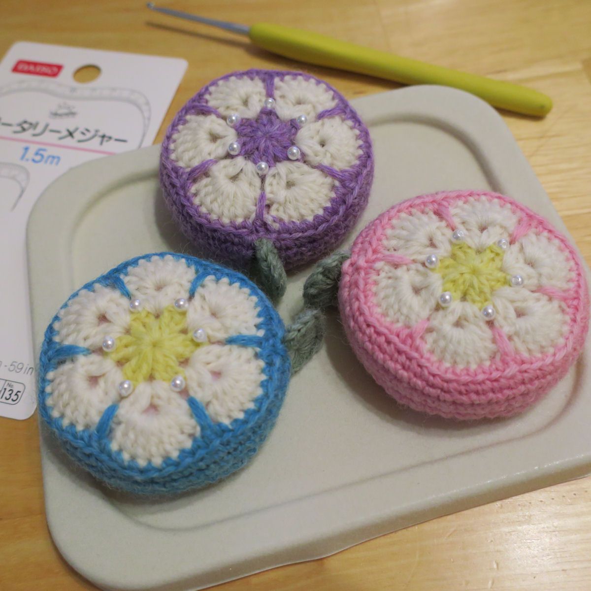 ダイソーでメジャーを買ってきて、またまた、アフリカンフラワーモチーフのメジャーカバーを編んでました。アフリカンフラワーモチーフを編んだところで、(毛糸は付けたままの状態で…)パールビーズを縫い付けるのですが、この作業で、セリアのパーツ用トレイがすごく便利でした。お惣菜のパッケージくらいペラペラな素材だけど、表面が起毛加工してあるので、丸いパールビーズも転がらなくて楽~ちなみに、普通の縫い針だとビーズの穴を通らないから、細めの刺しゅう針に、刺しゅう糸1本どり。パールビーズを縫い付けたら、フラワーモチーフから、細編みを往復編みで5段。最初の1段だけすじ編みにしています。メジャーにかぶせて、引き抜いて輪にします。花びら6枚のアフリカンフラワーモチーフは、長編み7目×6、花びらの間の長編み6目。この時点で、48目になります。6目ずつ減らし目しながら5段細編み。6段目は、全て減らし目して、9目になります。最後は、とじ針で9目をひろって絞って綴じます。これで、アフリカンフラワーモチーフのメジャーカバー完成。メジャーのつまみは、グリーンの毛糸で編みくるんでみました。つまみの穴が思っていたより細くて、2号かぎ針では無理があったので、レース針を使って細編みしてます。(^_^;)しばらくすると、段数とかあやふやになるので、自分の覚書きとしてブログに残しました。編み物ノートとか書いておくといいんでしょうけどね。