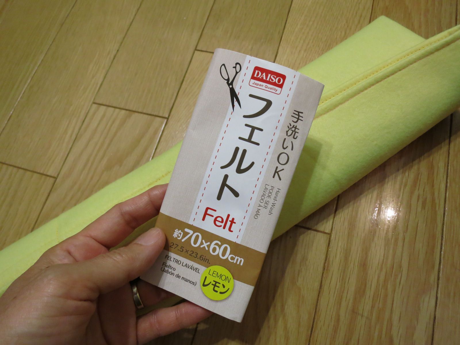 ダイソーで、大きなサイズのフェルトを買ってきました。緑色やピンクとも迷ったけど、「レモン」にしました。70×60センチのフェルトを全部使って、ミシンでまっすぐ縫うだけ。藤久のシングルフックアフガン針は35センチで、クロバーのダブルフックアフガン針(6~12号)は15センチ。短い針は埋もれないよう、ポケットを浅く。飛び出し防止のため、上をかぶせて、くるくるっと巻いて…使います。ケースの端にリボンを付けて結ぶとか、細長い巾着袋を作って(編んで?)入れるとか、まだ完成ではないですが、ばらばらに収納していたアフガン針をまとめられました。ポケットの空いた部分には、ハサミやとじ針も入れられそう。
