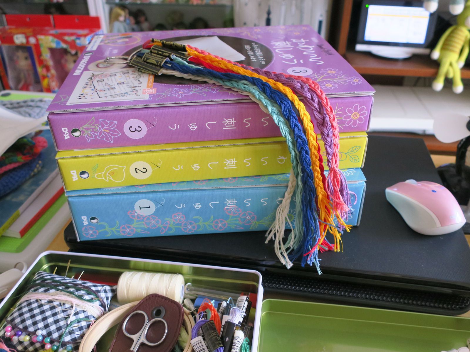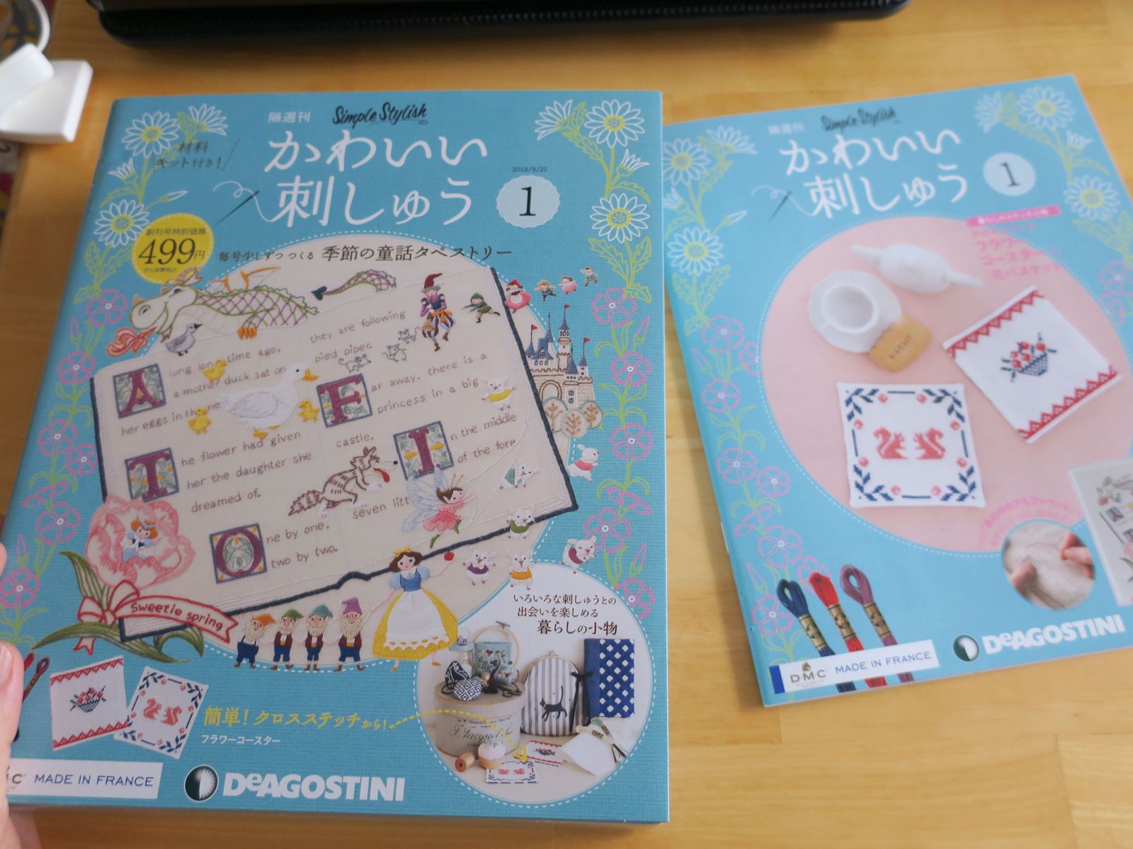 ディアゴスティーニ「かわいい刺しゅう」買っちゃいました~必要な道具や材料も少しずつ付いてきます。初回は、縫い糸、刺しゅう糸3色、針セット、図案プリント済みの布、クロスステッチ用の布。刺しゅう糸はフランス製ですが、通常の半分で1かせ4メートルでした。(^_^;)なので、カセをほどいて半分に折って、さらに三つ折りにして端をカット。これで、使いやすい約60センチになります。ラベルを戻して半分に折って三つ編み。輪の方から、1本ずつ刺しゅう糸を取り出せます。これは、刺しゅう作家のアンナスさん方式。テキストによると、まずは、図案の布が断ちっぱなしなので、ほつれないよう、縫い糸でかがり縫いすることから。それから、アウトラインステッチの練習です。初心者向けの内容ですが、この先、こぎん刺しや、リボン刺繍もあるんですって。ゆっくり楽しみたいと思います。