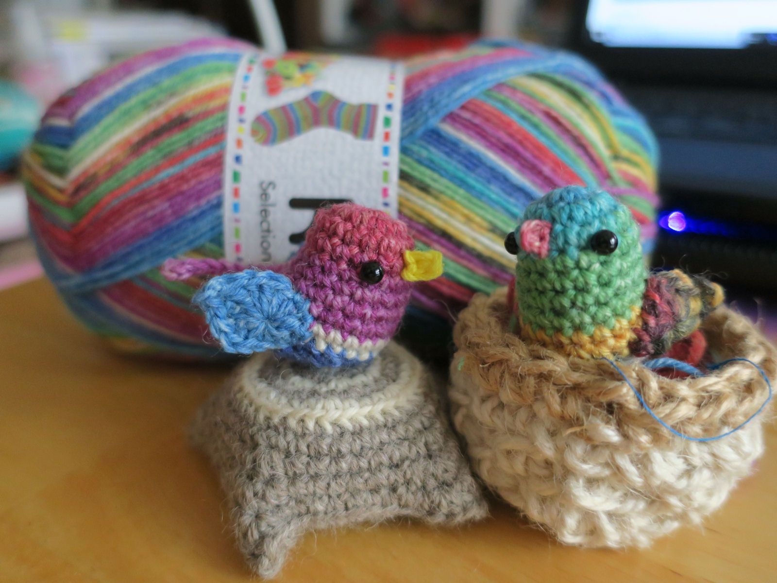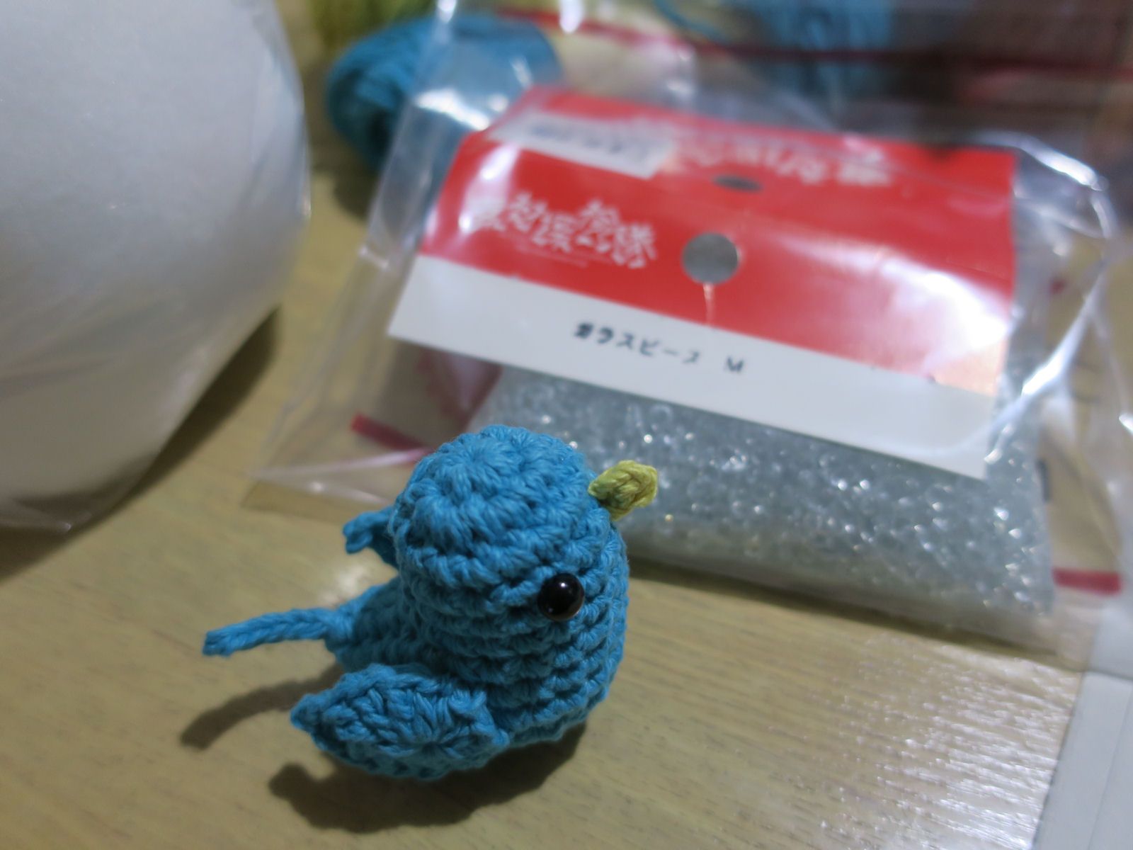 meetangさんのYouTube動画で、小鳥の編み方がUPされたので、買ったばかりのopal毛糸で編んでみました。色の出方が心配だったけど、インコのような色合いの小鳥になりました。4号かぎ針で編んで、この大きさ。小っちゃくてすごく可愛い~編むまでは、尾っぽの部分が編み終わりだと思ってたけど、違ったんですよ。頭から編み始めて、6段目で尾っぽの部分を編んで、そのままお腹側へ編んでいくんです。この大きさなら、キーホルダーにしても可愛いね。
