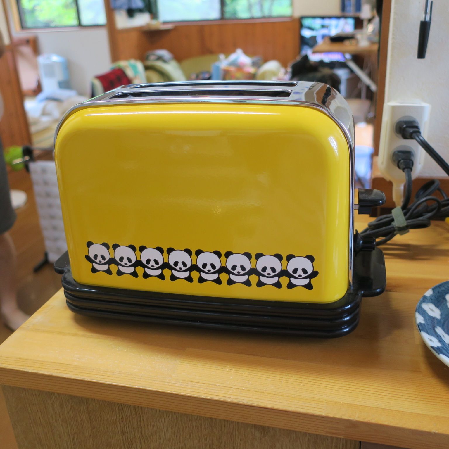 これ、可愛いでしょ?何年も前に、通販生活で買ったパンダトースターです。お山の家に置いてるんですが、長らく使ってませんでした。1か月ぶりにお山に来たんですが、オットが、急に朝食のパンをこれで焼きたいって。焼き色調節ダイヤル付き。レーズンパンなので、分かりにくいけど…こんな焼き上がりです。今日は、朝からずっと雨がザーザー。家の中は21℃で、半袖ではちょっと寒かったです。夕食後、ホットカーペット使ってます。おまけ今日、お山で編んでたもの。お花のモチーフをつなげながら編んでます。おざぶにするつもり。