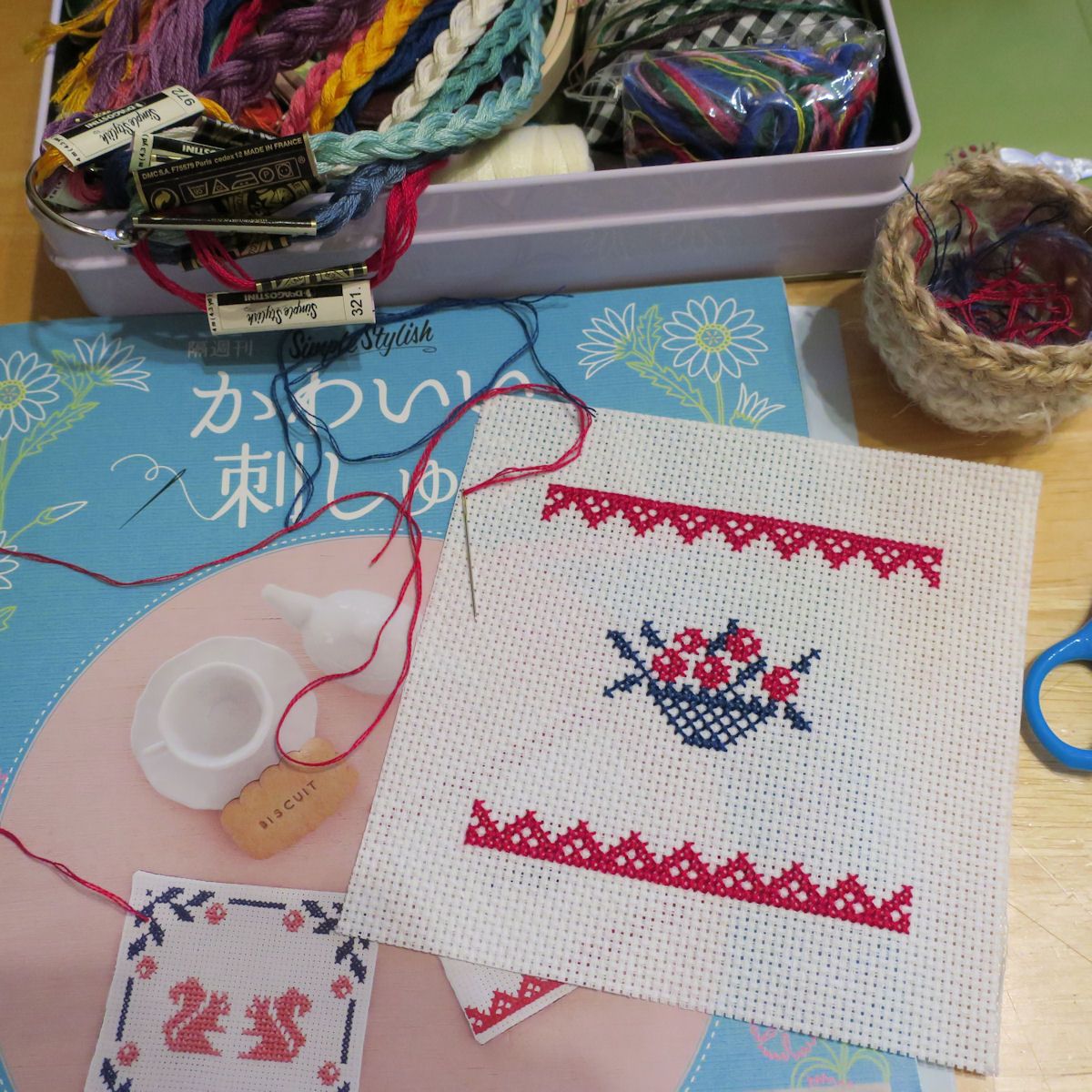 ディアゴスティーニ「かわいい刺しゅう」の2号と3号が届いたので、まずは、付属のDMC刺しゅう糸を三つ編みに。刺しゅうを始めてから集めてたのは、日本製のコスモやオリムパスの刺しゅう糸。針やトレーサー、刺しゅう枠などと一緒に空き缶に入れてます。DMC刺しゅう糸も同じ缶に入れておくことにしたので、すぐ取り出せるよう、リングでひとまとめに。で、今日は、クロスステッチに初挑戦。テキストと図案を頼りに、布のマス目を数えながら、××××…クロスステッチって、こんなに細かいステッチでした?これは、花バスケットのコースターになる予定なんですが、刺しゅうの作業時間1.5時間って書いてあったのに、倍の時間かかっても、まだ半分も進んでない…(^_^;)