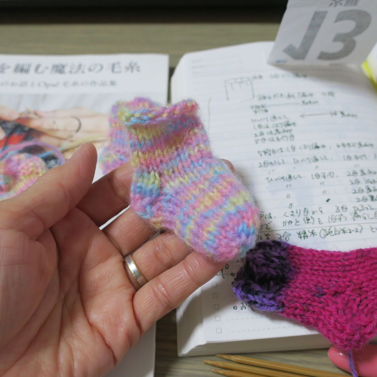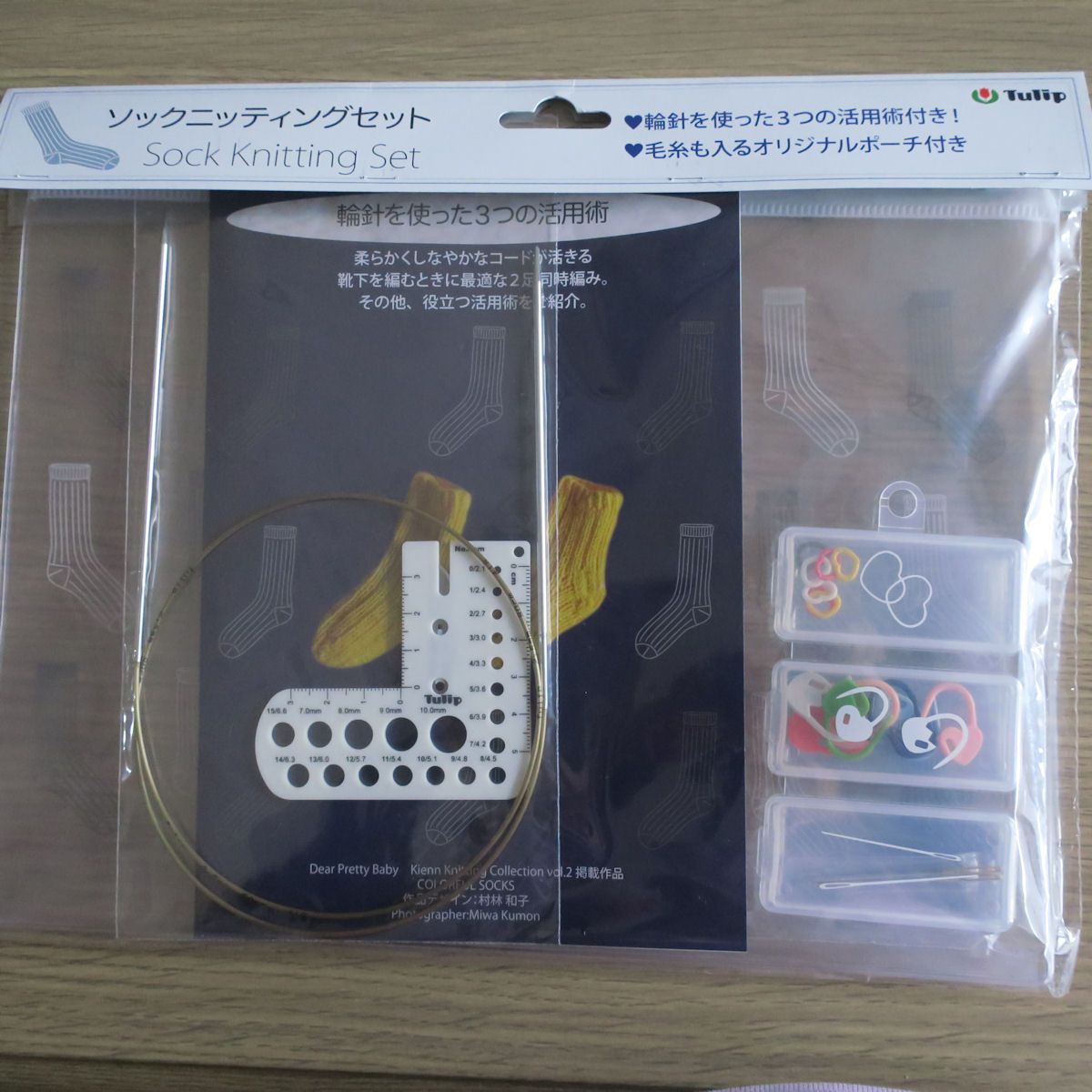 靴下の編み方も色々あるのですが、輪針を使って、つま先から編む方法の動画を観て、どうしてもやってみたくて、Tulipのソックニッティングセットを買いました。1号80センチの輪針のほか、段数リングやとじ針、毛糸も入るポーチのセット。コードがしなやかで柔らかな輪針は初めてです。試しに、16目のミニ靴下を編んでみました。半分編んだら、向きを変えて、針を入れて出して…上手く説明できないけど、ちゃんと、小さくても輪編みができちゃう。もちろん、往復編みで平編みもできるから、靴下のかかとを編むときも大丈夫。慣れている人は、靴下1足ぶんを、同時に編んでいくんですって。途中で失敗しちゃったけど、ミニ靴下のかかとも編めましたよ。(・o・)練習して、大人サイズの靴下編みもやってみるつもり。