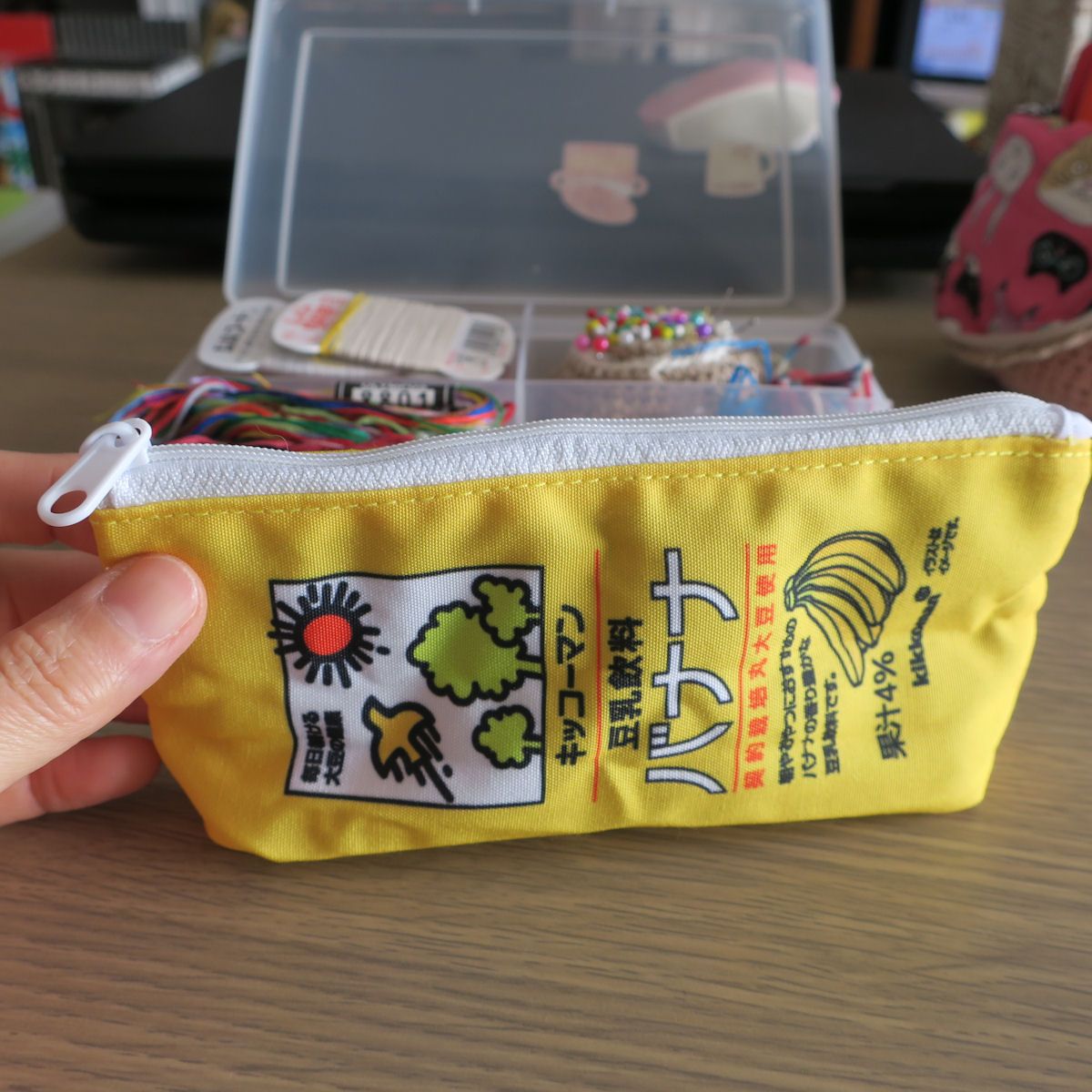 ガチャガチャで出た、豆乳ポーチ。バナナ味。これが、3COINSで買ったワイヤレススピーカーにピッタリなんです。今回、お山の家にスピーカーを持参するときに使いました。ただ、そのままでは、うすっぴらい布のポーチなので、毛糸で内袋を編んで縫い付けました。100均で買ったウール100%の合太で、ポーチの底に合わせて、細長い長方形底を細編みして、長編みで側面を編んでます。これで、スピーカーがガタつかず、衝撃も和らげます。毛糸で編んだバッグなどに、布製の内袋を付けるのはよくあるけど、毛糸の内袋を編むのは初めてかも。ちなみに、ポーチの底にも、こんなデザイン。