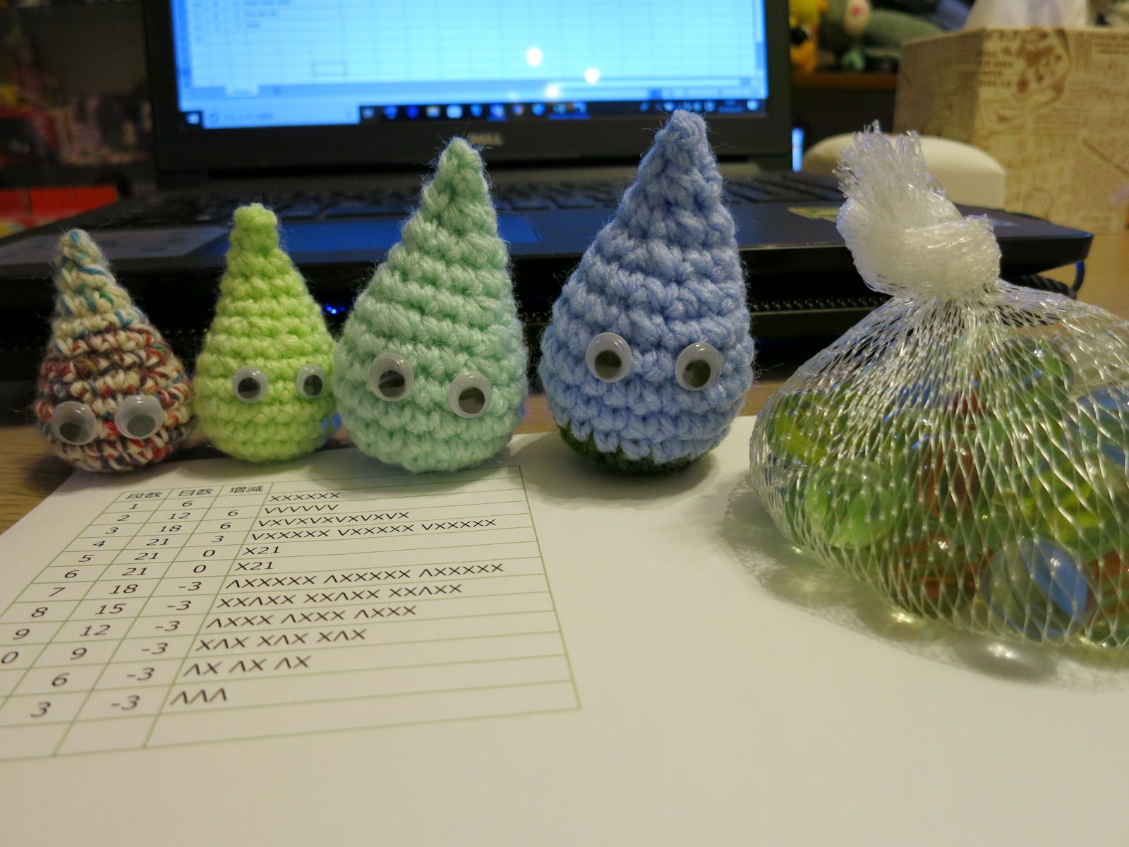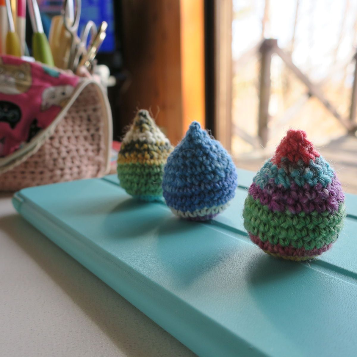 こみぃさんのリアルオフ会に参加した人を中心に、おちょぼちゃん作りが流行中です。特にきまった編み図があるわけではないけど、shima-franさんが考えてくれた編み方で、まっしーさんがYouTubeLIVEで実践してくれたのをきっかけに、色んな毛糸で、様々な大きさのおちょぼちゃんが、InstagramやTwitterで広まってます。遅ればせながら、私もYouTube見ながら編みました。リアルオフ会のビンゴでGETした、こみぃさんが編んだおちょぼちゃんより、シュッとしたおちょぼちゃんになります。もう少し、ぽってり感が欲しいので、自分なりの編み方をExcelでメモしたり。綿を詰める前に、ガラスペレットやビー玉を入れて、おきあがりこぼし風にしたり。opal毛糸で編んだ小さなおちょぼちゃんは、もちろん、ストラップに。これも、流行中です。