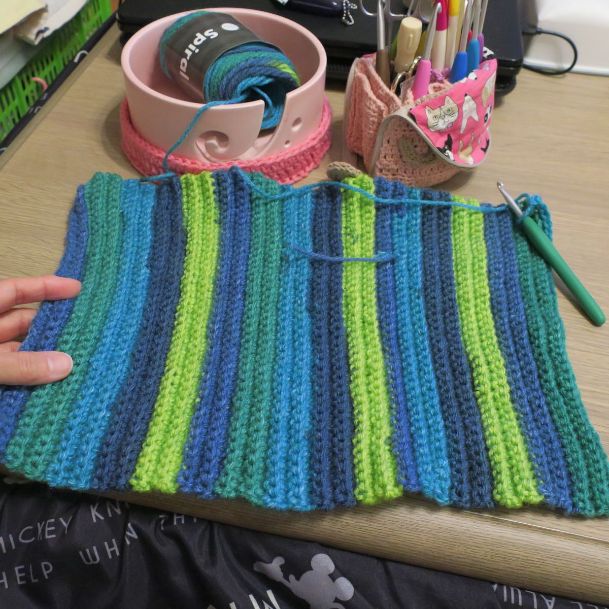 今日は、お昼ごろから、ひたすら畝編み~何度も何度も合わせてサイズを決めました。T-falの電気ケトルのために編みました。自宅のT-falに使うわけではなく、お山の家にあるT-fal用です。2週間以上使わないので、帰る前には、大きめ布巾をかけてるんですが、毛糸でカバーを編もうと思ってたんです。最初は、てっぺんから輪編みでって考えたけど、ちょっと形が難しい。そしたら、YouTubeで、meetangさんが、帽子みたいなティーコゼーを編んでるのを見て、そうだ!帽子だ!で、畝編み帽子と同じ編み方にしました。電気ケトルをすっぽり覆える大きさになるまで、ちょっと時間がかかりましたが。脇と天辺を細編みとじして、簡単に仕上げました。伸縮性がある編地なので、着脱も楽です。