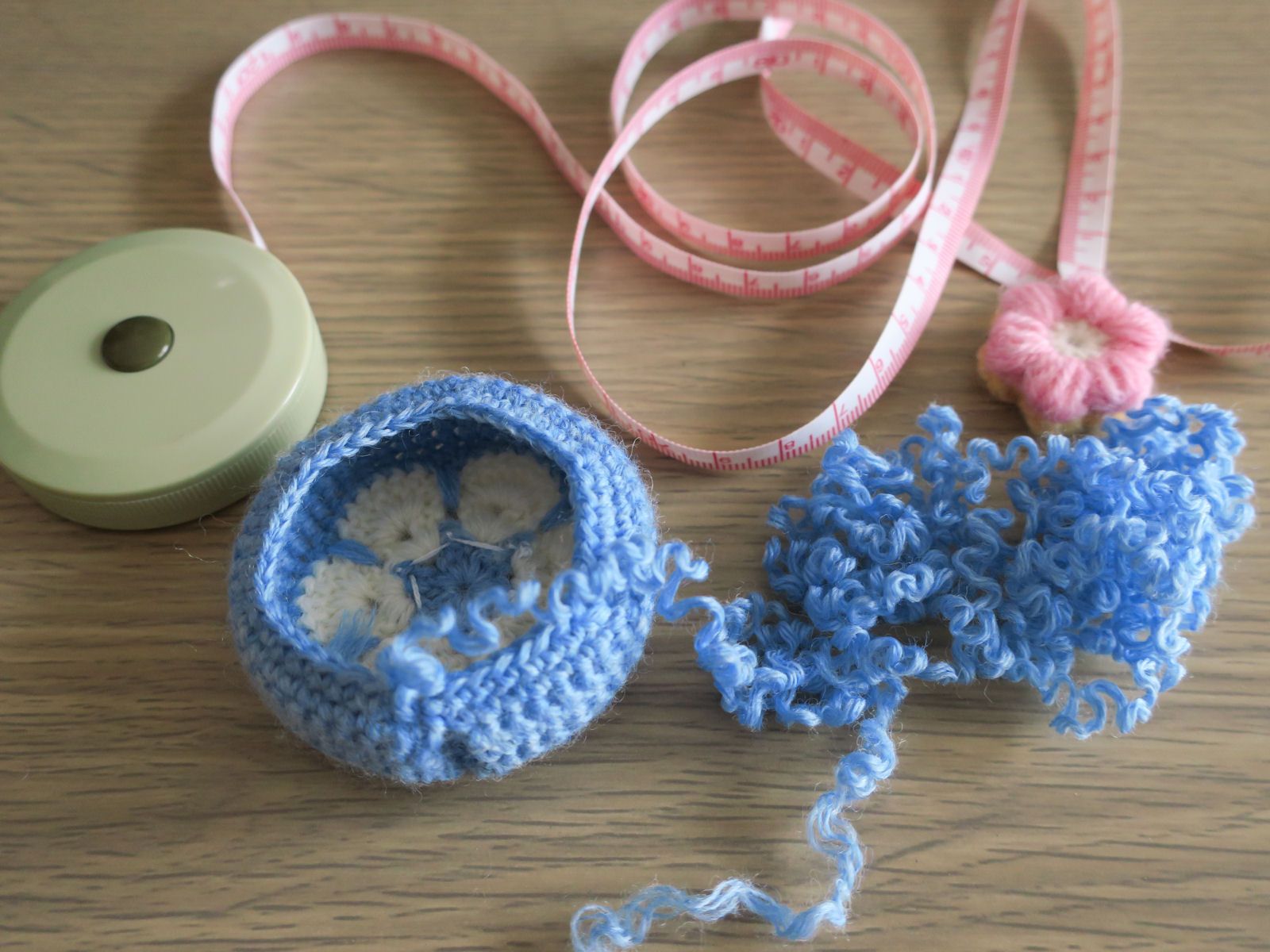 靴下もそうですが、編み物の時、メジャーは欠かせません。100均のロータリーメジャーを愛用してますが、ボタンを押しても、メジャーが戻らなくなってしまいました。全部引き出してみたり、何度も試したけどダメ。せっかく編んだカバーごと処分するのはもったいないので、毛糸をほどいて、壊れたメジャーを取り出しました。新しいロータリーメジャーを入れて、ほどいた毛糸で編みくるみ。新しくお花を編んでメジャーのつまみに付けました。お花に葉っぱを添えたデザインです。これで、また楽しく使うことができます。ちなみに、裏はこんな感じ。フェルトを付けて隠しておこうかな。