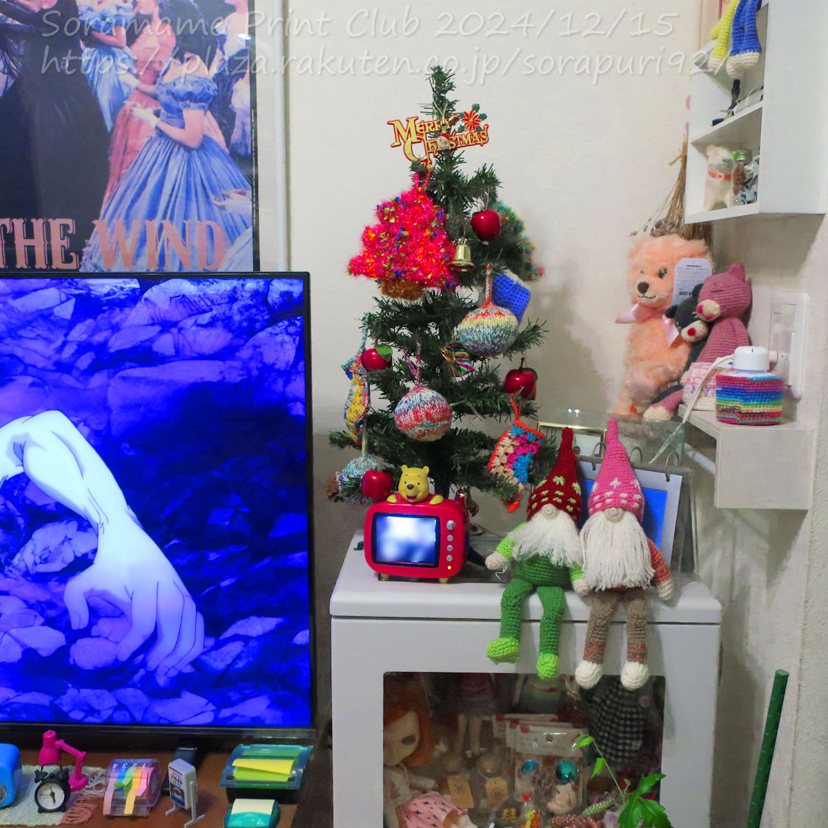 クリスマスまで10日…(は、早いわ…)今日、ようやくツリーを出しました。本来はリンゴだけのツリーですが、私が編んだボールや靴下などなど、あれこれ吊るしてあります。あみぐるみのトムテも座らせました。…隣のテレビ画面に不気味な画が写ってますが…primeで「はたらく細胞」アニメ版を見てるんです。金曜日に実写版が公開されてから、アニメ版も全話primeで見られるようになったの。見始めたら面白くって。で、実写版予告で見た、白血球役の佐藤健が、アニメのキャラクターまんま!実写版もぜひ見たいわ~