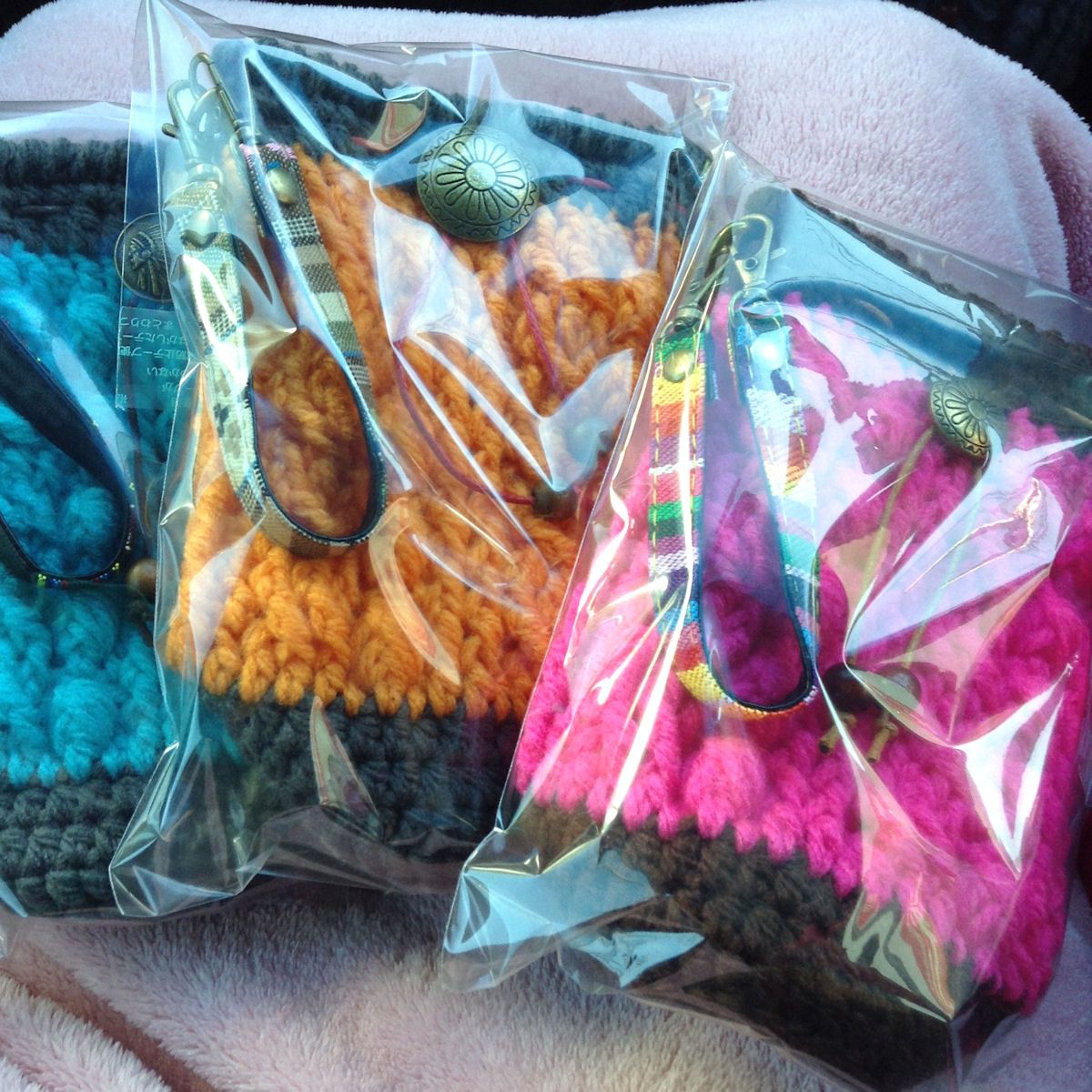 年末年始で編んだ、ペットボトルホルダー3つ。ハワイアンブルー×グレー、オレンジ×グレー、ショッキングピンク×チョコレートブラウン。今日、オットの実家へもっていきました。ちょうどみんな出かけてて会えなかったけど、お義母さんは何色を選んだかなぁ…
