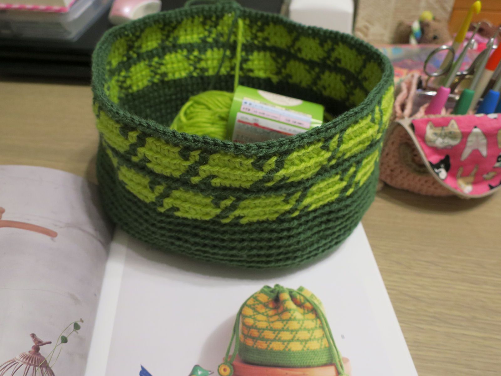 籠目の巾着です。ダイソーアクリル毛糸の緑色と黄緑色(エバーグリーン×グリーンアップル)を使ってます。まだ半分も編めてないけど、規則的な編み込み模様なので難しくはありません。