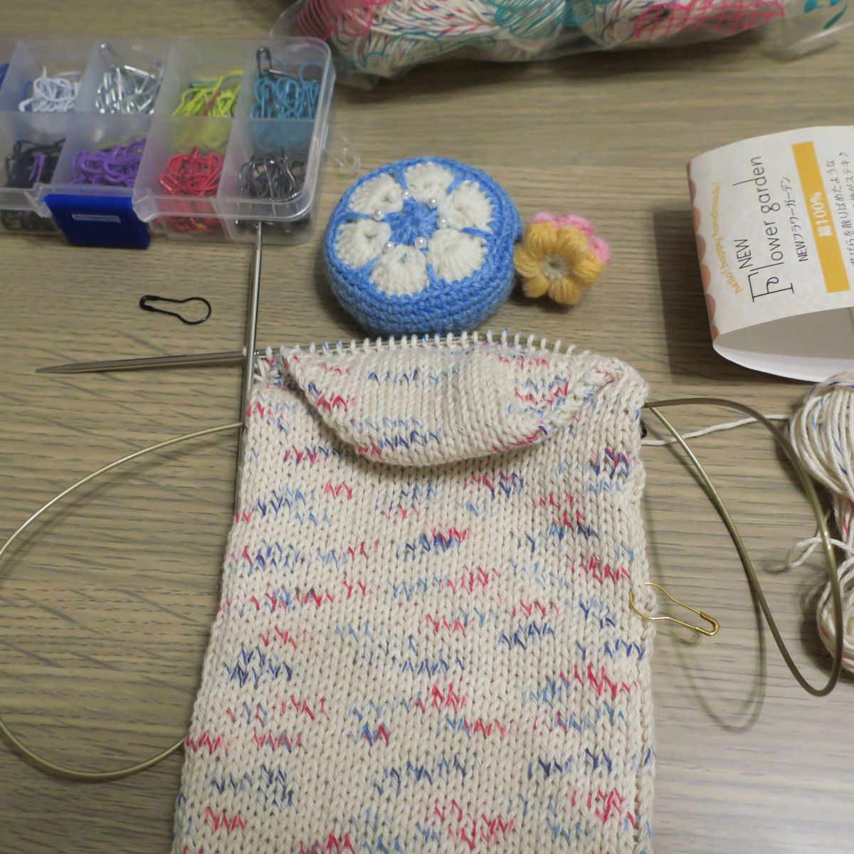 セリアのコットン糸で編み始めた靴下。NEWフラワーガーデンという糸ですが、小花を散らしたような可愛い編地になります。Judy式の作り目とつま先の増し目にも慣れてきました。