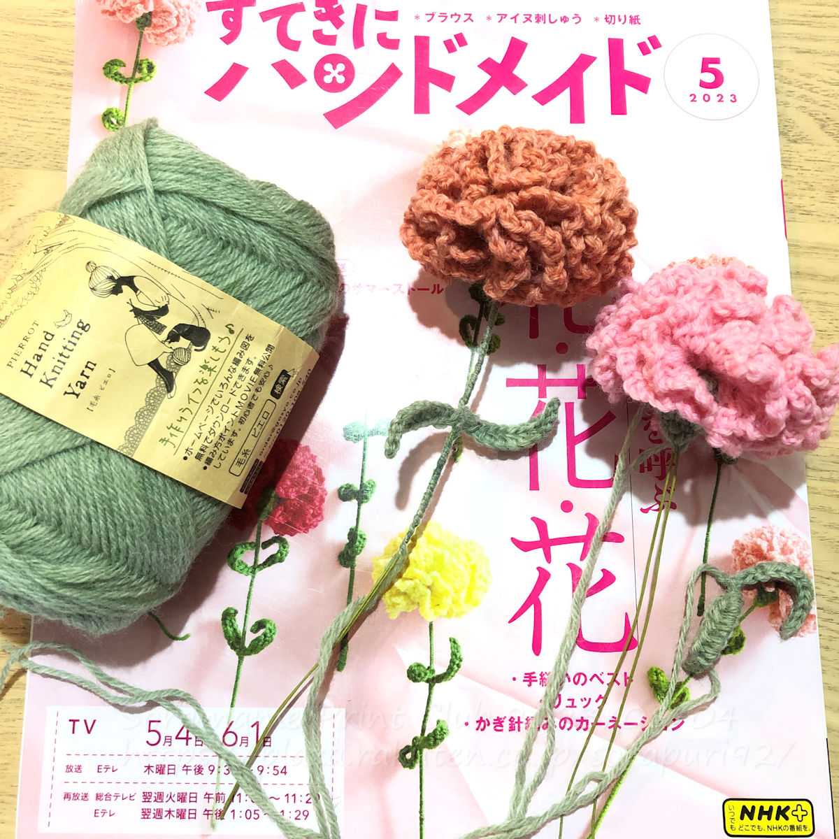ガクと葉っぱも編んで、カーネーションの仕上げに入りました。