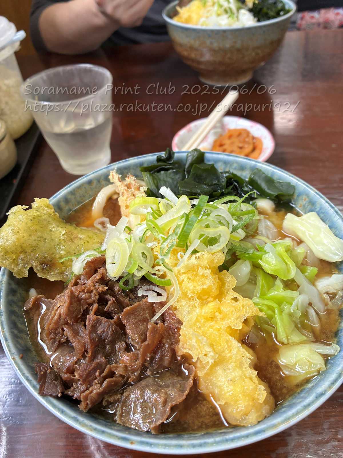 えび天、ちくわ天、ゆでキャベツ、肉、わかめ。