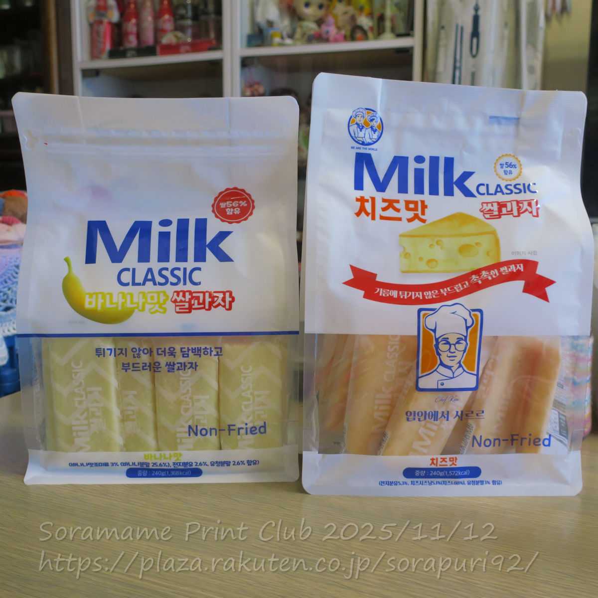 明洞のお土産屋、ロッテマートでもおなじみ通称「ミルクせんべい」ふつう味の小さいのは、日本のダイソーで買えるので、バナナ味、チーズ味、メロン味を買ってきました。パッケージの쌀과자は、米菓のこと。そして、ノンフライです。バナナ味とメロン味は、優しい甘みで、想像がつく味だと思います。チーズ味は、見た目もチーズっぽい黄色。ほかの味と違い、チーズの塩味もあって、これ、おつまみにもいいかも!そして、ミルクせんべいのこの食感…ふわふわでサクサク~♪軽くて、何個でも食べられちゃう~(๑´ڡ`๑)