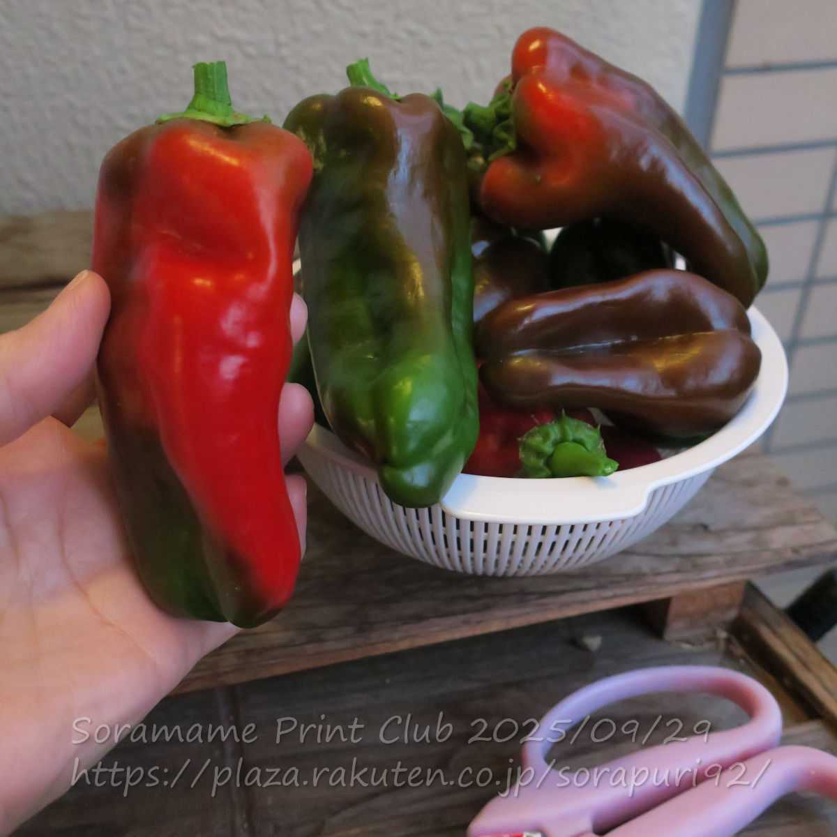 もう途中から数えるのをやめちゃってますが、ジャンボピーマンは、その後もジャンジャン収穫してます。1個100g以上の大きさになる前に赤くなっちゃうので、今日も どさっと収穫して、無限ピーマン作りました。プランターに苗を1つ植えて、今この状態。ピーマンの重みで、枝が下向いちゃってます。今でも、大きいのはこれくらい。葉っぱと同じ色で分りにくいけど、まだ枝にたくさんぶら下がってます。ちなみに、ポリッキュと強健豊作キュウリは、お山に2泊して帰ってきたら、すっかり枯れちゃってました…庭のフェンスや物干しに絡んでたツルは撤去。ポリッキュは38本、強健豊作キュウリは24本でした。毎日楽しみに見てたので…ちょっとキュウリロス。