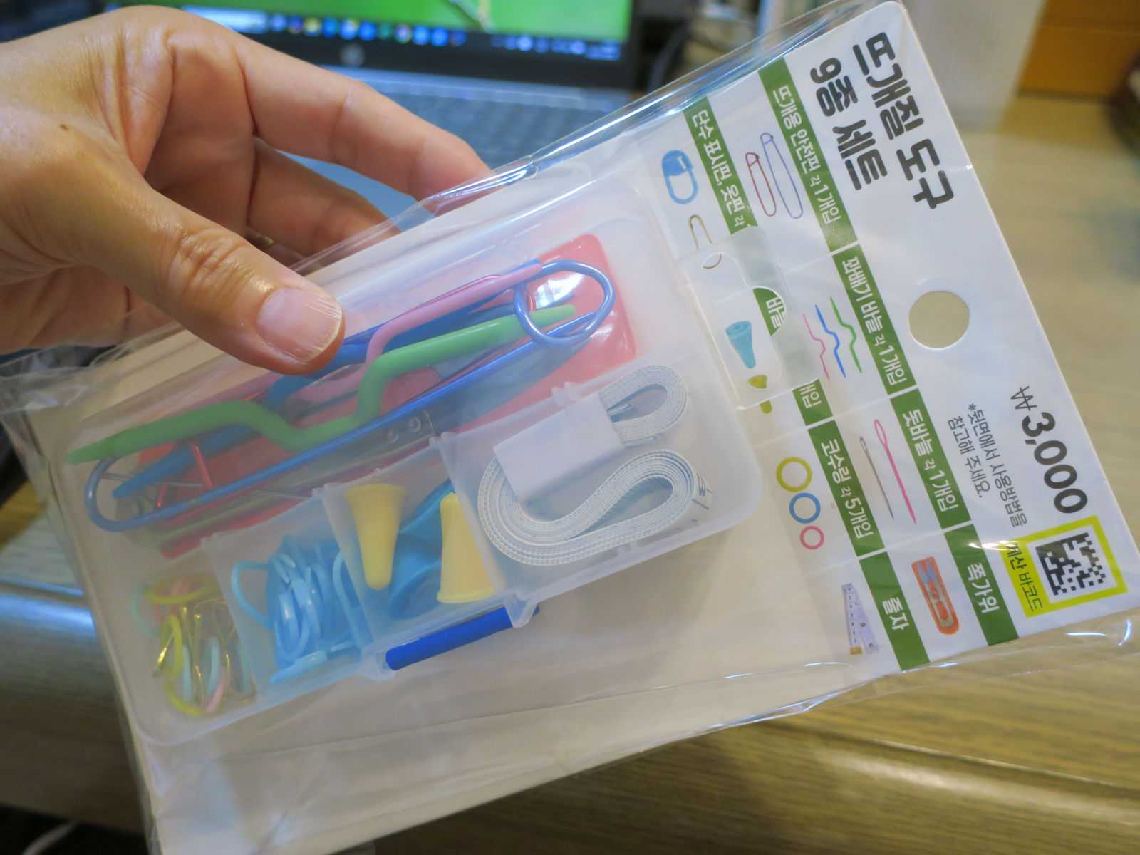 10月7日(火)韓国3日目、ソウル駅のロッテマートにあるダイソーで買ったもの。これ、編み物用小物セットなんです。編地のほつれ止め、縄編み針、とじ針、ハサミ、マーカー、ニットピン、棒針キャップ、目数リング、メジャー。どれも使いやすそうなものばかり。これだけそろって 3,000wonは 安いと思います。