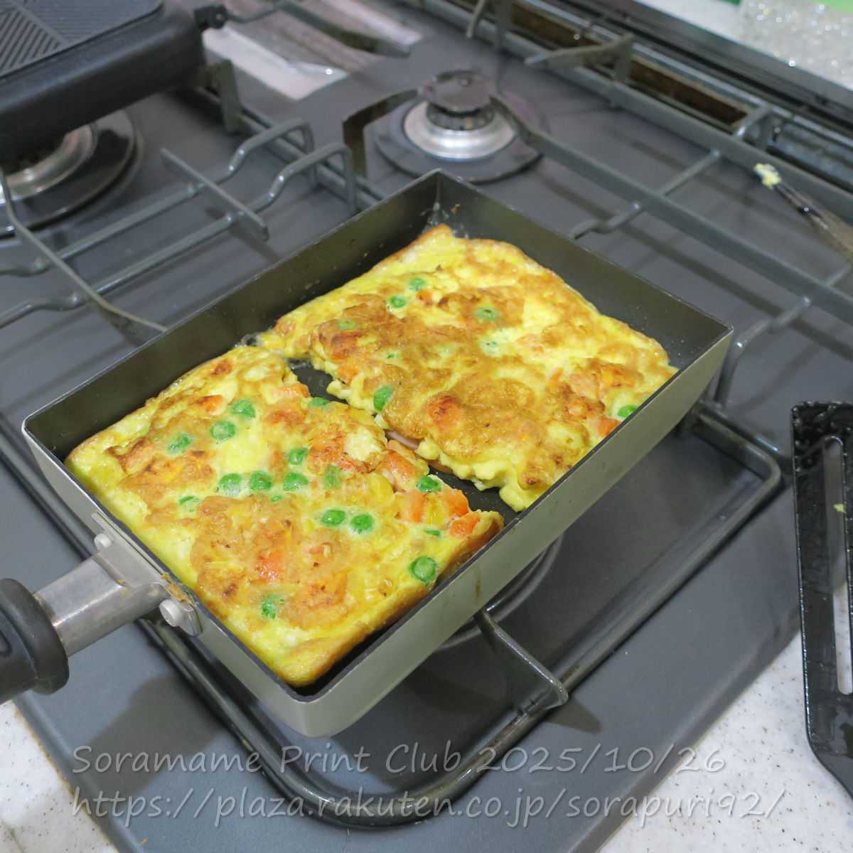 昨日に引き続き、今朝も作りました。まずは、卵2個にミックスベジタブルを混ぜて、卵焼き器で焼いて、二等分。ハムものせて、裏返しながら焼きます。ホットサンドメーカーの片面を熱して、バタ~♪食パン、はちみつ、卵焼きを重ねて、ケチャップ~スライスチーズをのせてから、食パンを重ねて、その上にチューブバターをのせてから、両面をこんがり焼いて完成~はちみつでパンに甘さを加えたほうが、より、Issac Toast っぽくなったかな。(๑´ڡ`๑)