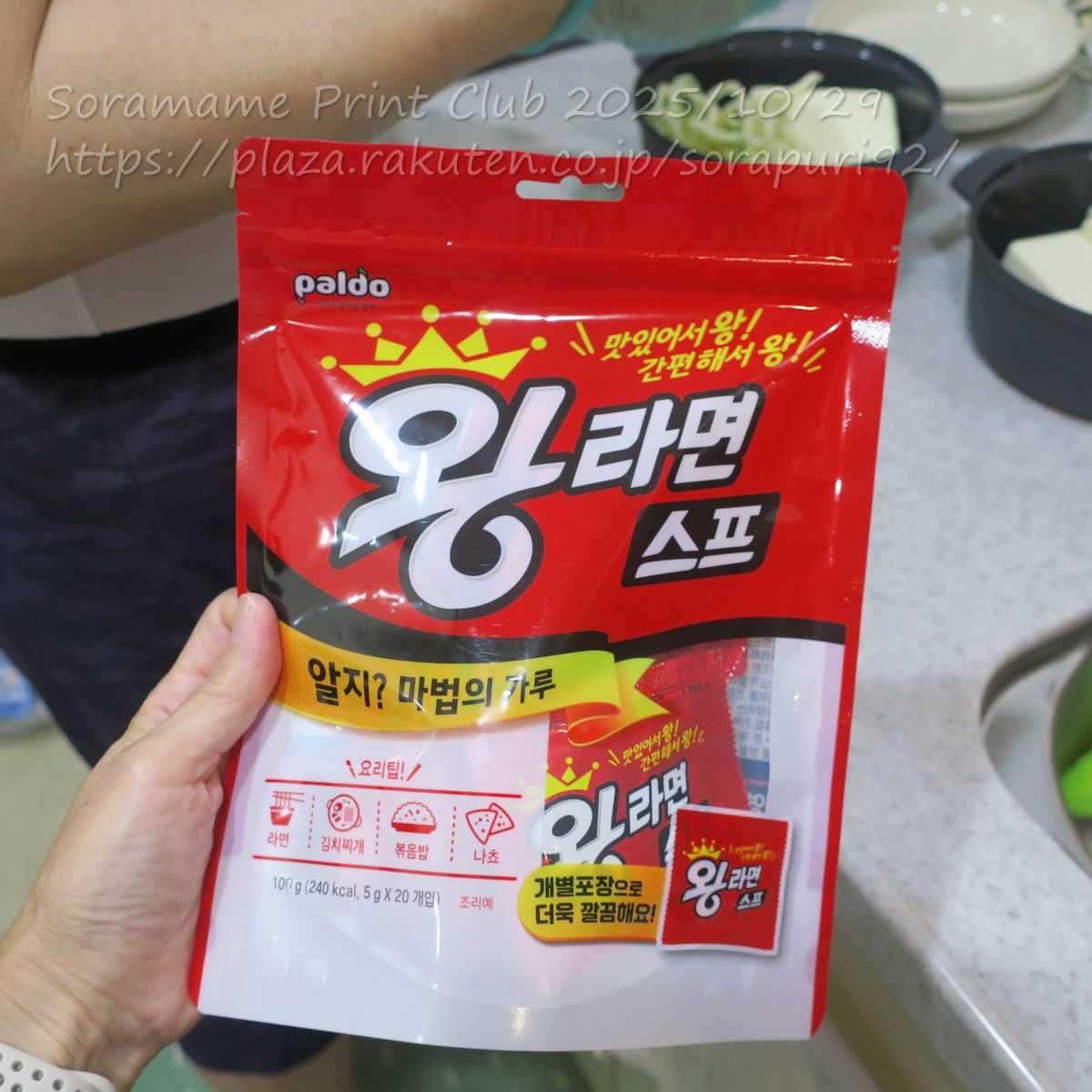 韓国のスーパーで買ってきた辛いラーメンのスープ。ハングルでは「王ラーメンスープ」と書いてあります。ラーメンのスープだけ、20袋入ってます。ダイソーのレンチン鍋に、豆腐と具材と水と一緒に入れて、水を200㏄とスープ1袋で作りましたが、豆腐からの水分もあるし、もっと辛くてもよかったかも~