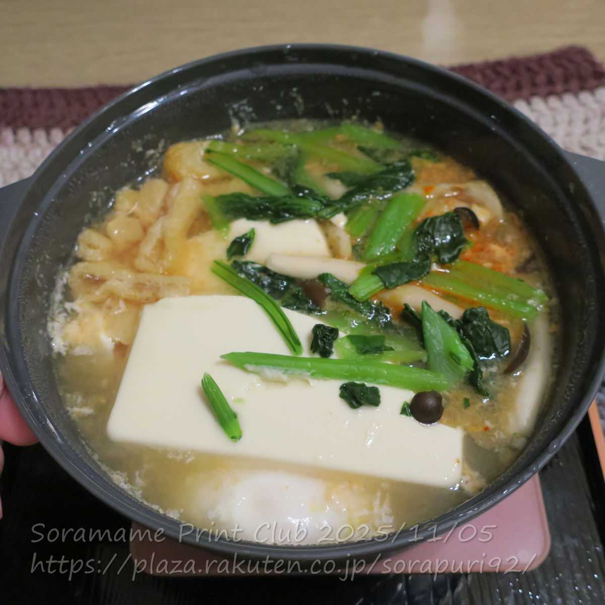 今日は 雲が優勢で、日中も外の温度計は15℃あったかな?スポーツクラブへは、半袖Tシャツにウインドブレーカーを羽織って行くんだけど、寒くて、長袖Tシャツを重ねていきましたよ。洗濯物も冷え冷えなので、浴室乾燥機で仕上げました。夕食は、豆腐メインの鍋。今日は、キムチ味(鍋キューブ)たまご入り。(๑´ڡ`๑)