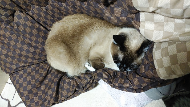 最高気温11度、最低気温2度、曇りところにより晴れの予報です。早朝はかなり冷え込みました。午前6時頃にライにご飯が欲しいと鳴いて起こされた時は寒くて、温度計を見たら、部屋の中で8度でした。すぐに上着にカーディガンを着て、二階から一階に下りていったら、一階の温度計は7度を指していましたので、かなり冷え込んでいたのですね。それにしても、ライがご飯が欲しいって鳴くのは、かなり大声だったので、眠たくて、きつかったです。仕方なく、階下に下りていって、ライにご飯をあげました。いつもだったら、寝る前に器に入れていたので昨夜は忘れていたのだな~って。これは仕方がないですね。目をこすりこすり、階段をゆっくり下りていきました。ライはとんとんとんと階段を下りていっていました。かなり元気ですね。きっと起きた時、二階から階段をおりていったら、ご飯が少ししかなく、全部食べてしまったら、無くなったってところでしょうか。またご飯を加えてあげました。そしたら、カリカリと急いで食べていました。ごめんね~って、撫でてあげたら、ゴロゴロと喜んでいました。その後、2度寝をしたライでした。もちろん私もね。寒かったのでエアコンを入れてから寝ました。私が癖をつけさせたのがいけなかったですね。夜に食べさせ、早朝に食べさせるのが、辛かったので夜に朝の分も出していましたから。早朝の時刻はライにとっては、起きてすぐの朝5時くらいだったって事でした。主人が仕事の時は朝に早く起きてご飯をやっていますが、休みの日はついゆっくりになっていましたので、夜に用意していました。昨夜は夜に出しておいたご飯がちょっと少なかったみたいですね。ほんとよく食べる子です。時々、チャオチュールを欲しがって鳴く時もありますし、ふりかけを欲しがって鳴くことも。ご飯を食べないで鳴いているので分かります。まだまだ寒い日が続いていますね。コタツの袖で寝ているライ。にほんブログ村ぽちっとね、いつもありがとうございます。励みになります。