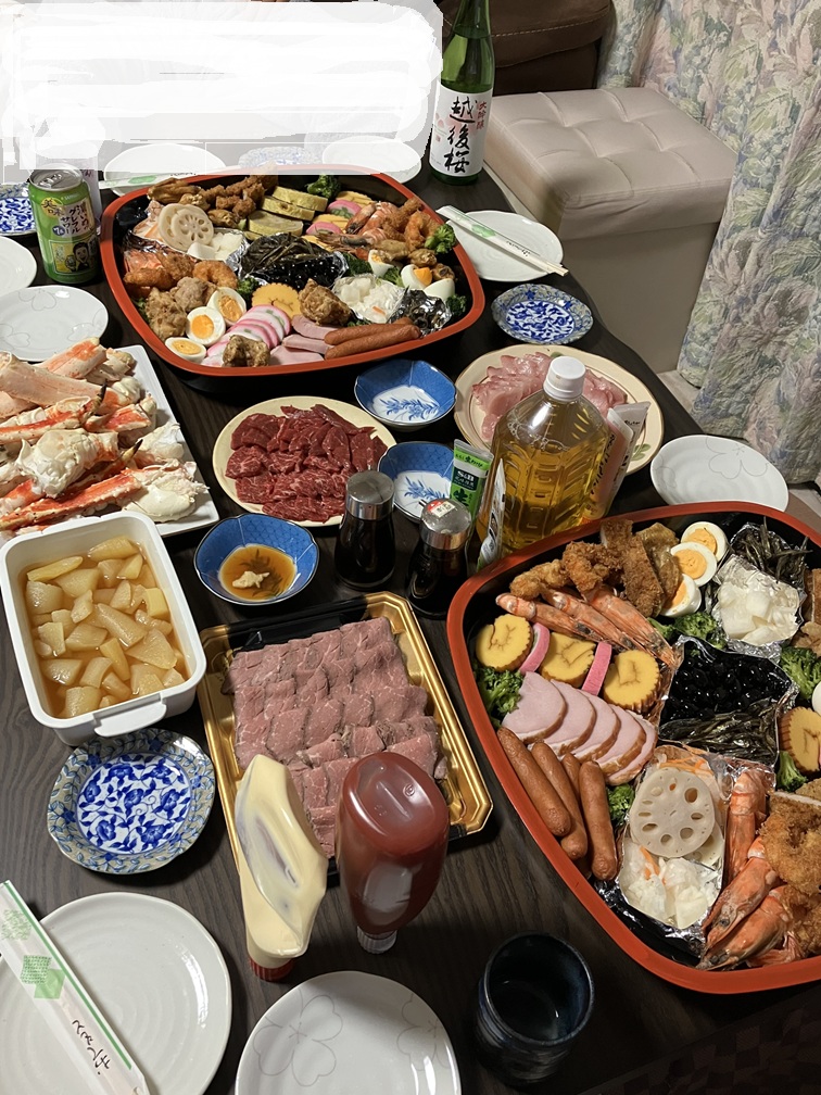 今日は何だか暖かい日になりました。コートを着ていたら少し汗をかくくらいでした。でも朝から雨が降っていて明日も雨の模様です。その後、数日したら雪が降るくらいに寒くなるそうです。土曜日日曜日が雪のそうです。嫌ですね。せっかくの休みなのにね。さて、今日は年末に作ったオードブルの写真でも載せましょうね。上の四角い白いところは主人が座って、お酒を飲んだくれていれているところです。食べては寝て、寝ては食べたいるところです。隠しておかないとね。息子はカニエビにアレルギーがあるので、主に肉類を食べていました。娘はカニエビが大好き、一人で思いっきり食べていました。今年のカニは2万5千円のタラバガニを買いました。このカニ工場の中で一番高かったかも。いえ、一番高いのは生タラバだったかな?わが家はいつも年末に作ったご馳走のオードブルを大晦日に食べています。そして年末の鐘がなる前に年越しのお蕎麦を食べてその後寝ていますね。次の日のお正月に残ったものを重箱に入れてその他でカツオ菜とお餅とぶりが入ったお雑煮を食べます。でもブリはみな嫌いなので、けんちん仕立てのお雑煮を食べていますね。年越しそばもけんちん仕立てです。これが息子が大好き、小わんものではなくて、いっぱい食べています。寝られるのかしらね。ぶりの刺身はみな好きなのにね。こちらではマグロの刺身は食べないです。でも我が家は主人が熊本に行ったお土産に馬刺しを買ってくるので、それを食べることが多いです。今年は途中で博多に寄り、チーズも買ってきましたので、ビスケットにつけて食べました。結構髙いです。買った場所は博多阪急の地下だったそうです。馬刺しについては熊本のなんたらと言うデパートだったそうです。全部で1万円近くかかったと言っていました。チーズは3000円近くかかったそうです。いつものコースです。ワガママ言って行っているのでこれは仕方がないですね。ライちゃんの大欠伸、眠たくて私のほうを向いて鳴いていました。早く寝たいよ~って言っているのでしょうね。まだ目を開けていますが、その後寝てしまっていました。やはり12時過ぎにはもう起きていられないみたいですね。ごめんね。にほんブログ村ぽちっとね、いつもありがとうございます。励みになります。