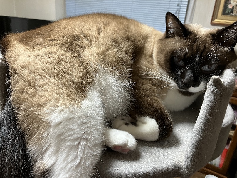 かなり寒くなってきましたね。年末年始は温かくなってきましたが早朝は冷え込みました。風邪ひきが長く身体がおかしくなっていました。少し微熱も出てだるい日々でした。ブログを書くこともできず皆さんにはライちゃんの姿を見せることができなかったですね。すみません。私はさきほど言ったとおり、微熱が続き、主人との話し会いも冷え込んでおかしな感じになっていました。何事も話そうとしたら止められてしまい冷え込んでいたので辛い日々でした。その中、おせちをずっと作っていたので足元が冷え込んで下半身が冷え込み辛い日々でした。咳は痰がでて汚い感じになってしまいました。一応、先生には連絡を入れて早めにレントゲンをすることになりました。だるく感じる身体が気分も思い込みも悪くなるものですね。でも主人が考える言葉についても何でも明るく考えることにしたらこちらも明るくなるものですね。私には娘も息子も力になってくれる子たちがいると思うとほっとするものですね。頑張ります。ライのお母さんたち、友人たちの言葉が力になっています。ライの家族の写真がとっても可愛いです。4人が集まった姿でご飯を食べている姿がとっても可愛くて私もライがご飯を食べている姿を送ってあげました。ほんと可愛いです。明るい一年が暮らせますように、皆さまも明るい年がきますように。願っています。貫禄がある姿になったライです。お腹も出てきました。娘はお腹が出ていて大丈夫??って気遣っていました。私も心配だったのですが、先生がお腹を触っていて、何も言わなかったので大丈夫だったのでしょうね。そう言えば、年末にシャーと先生に向かって鳴いていました。私は怖かったです。また引っ掻かれるの??って。今はベッドで気持ち良さそうに寝ています。ほんとおかしなものですね。にほんブログ村ぽちっとね、いつもありがとうございます。励みになります。皆さまも今年もどうぞ宜しくお願いいたします。ライちゃんも宜しくね。