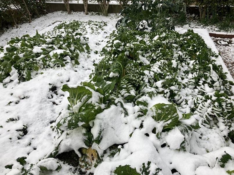 最高気温5度、最低気温2度、曇りところにより小雪の予報です。昨夜10時頃から小雨になってその後雪が降ってくる予報でした。その雪がガンガンに凍って、朝にはその硬い雪の上にふわっとした雪が降って積もってしまいました。主人も会社に出かける時に道路が凍ってしまっているので滑ることも考え、会社に連絡して今日はお休みすることになりました。連絡を入れると他にもお休みした人が多かったみたいです。次回主人が行く場所に行っている人は休まずに出かけたみたいです。きっと来年からは主人も休まないで行くようにするのでしょうね。そんな時はタイヤを雪用のタイヤに変更しないといけないでしょう。実はディーラーに連絡して冬用のタイヤに交換することも考えていたのですが、今の段階では休んでも一日くらいなので変更はしないことになりました。入れ替えを考えると4本で8万円くらいはかかりそうです。でも一度替えると毎年そのタイヤを交換することで終わりそうです。自分で交換するのも大変なのでディーラーにして貰うことも考えています。その点を考えると一回につき1万円は必要なのでしょうね。それもね~。今回の雪も積もったのは2センチくらいでしたので温かくなって晴れてきたら雪も融けてきたので菜園に積もった雪をのけて出来た春菊を料理に使うことができるみたいです。同じく大根も使えそうです。良かったです。凍っても野菜って強いですね。小松菜も凍っていましたが、きゅ~~と立ち上がって今は元気です。それも抜いて夜ご飯に使えそうです。小カブも抜いて漬物にするつもりです。今年の雪の景色です。ライは窓の中から外を見ていて寒そうにしていました。今もコタツの中に潜り込んで寝ています。昨夜は私が以前使っていた毛布を出してそれを敷いたらそこに乗って寝ていたライです。エアコンを点けていたので温かかったのでしょうね。雪が降っていて、積もっているので今年初めてのことです。ほんと寒い一日になりました。にほんブログ村ぽちっとね、いつもありがとうございます。励みになります。