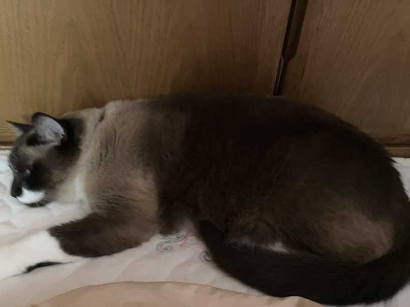 最高気温24度、最低気温19度、小雨の予報です。天気予報と同じく夜中からずっと雨が降っていました。前日は鹿児島県地方に線状降水帯ができて雨がずっと降り続け、今日は九州の北部にできるとの予報でしたができなかったのでほっとしました。明日は曇りのようです。ほんと良かったですね。今日は内科の通院日、お昼からの予約でした。1時には行って時間が来るのを待っていました。でも私より早くに来ている人がいたのでずっと待っているしかなかったです。結局自宅に帰れたのは午後3時半過ぎくらいでした。病院にかかるだけで疲れますね。帰りついたら疲れてしまいつい寝てしまいました。もう何もしたくなくなりこんな時間になってしまいました。今日はお休みいたします。申し訳ないです。自宅に帰ったら主人がいうにはずっと二階にライが上がったりきりということで行ってみたら、私の布団の上で寝ていたみたいでした。午後からずっと寝ていたみたいで寂しかったのでしょうね。ほんと可愛いです。昨日も私の後ろのソファーで座っていて鳴いてばかり、今から寝るから早く寝ようと言って何度も鳴いていました。私が声をかけるたびに鳴いていたライでした。では。目を覚ましたライです。でもまた寝そうですね。にほんブログ村ぽちっとね、いつもありがとうございます。励みになります。