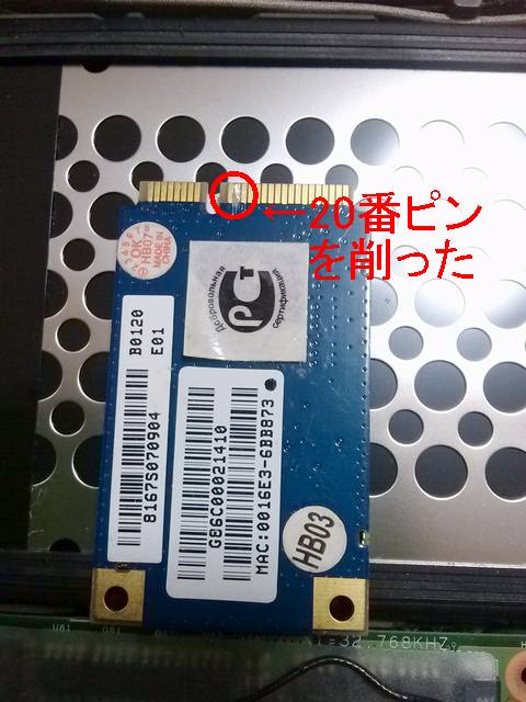 リンク先のページに書いてあるように、QCPASSで買ったAtherosチップのminiPCIeカードの20番ピンをマスク(ここでは削る)しました。これを右側のminiPCIeスロットに挿します。ちなみにピンを削っても左側のネットワークカードスロットに挿すと純正チェックに引っかかって1802エラーが出ます。