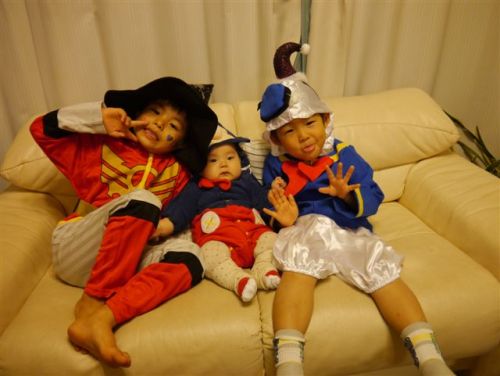 7歳1ヶ月&4歳9ヶ月&1歳3ヶ月お久しぶりです~!あっという間に一ヶ月経ってしまった・・怒涛の一ヶ月。次男坊ソラちゃんの保育園運動会あり、かなたんが1歳1ヶ月半で歩くようになり、そーたんの仲良しメンバーと一緒に実家の栗園へ栗拾いへ行き、昨日は近所のママ友達とハロウインパーテイーまずはソラちゃんの運動会。かけっこソラちゃん、女の子と同着で一位!両じぃじ&ばぁばも応援に駆けつけてくれて、かなたんはじぃじの肩車で応援親子競技は、パパとデカパン競争~まだまだポテポテのソラちゃん見ていても可愛いわ~ダンスもノリノリです(笑)リレーでは、年長さんの女の子を抜かしてダッシュ~真剣に走っていて、成長を感じました!抜かされたらわざと転んで大泣きしていたソラちゃんが懐かしい~長男そーたんの出番は、卒園生ゲームだけ。本人はリレーに出たくてウズウズしていたけど、さすがに走れるわけもなく・・同じ1年生がたくさんきていたので、校庭で勝手に遊んでました。保育園の運動会にそーたんが出ていないのが不思議な感覚でした。ソラちゃん一人も今年だけで、来年はかなたんが入園予定。運動会もまた忙しくなります。一番右写真は、実家の栗園にて。みんなで大自然を満喫~近所に酪農が多いのでそーたんの友達は「臭ッ」私達親子は、慣れすぎて分からな~い子供たちは、虫やカエルを捕まえて楽しく過ごせたのでまた来年も行こうっとこちら、靴を履いて颯爽と歩く、かなたん1歳1ヵ月半で歩行デビューし、あっと間に走るようになっちゃった・・言葉も「ばぁば」(←一番多い。何でもばぁばな気がする・・)「ママ」「パパ」「パーィパイ」(おっぱい星人なので常に言ってる)「バーィ」「タッチ」「キャッチ」とにかく、きゃわいい~あと、写真を撮るときに、人差し指でピースとちゃんとポーズ撮りますこれからも可愛いままでいてちょーだい昨日のハロウインパーテイーでは、子供たちのテンションが高くなかなか全員集合写真が撮れず・・そーたん・・ドナルドかなたんが、ずり落ちてますけど・・久々に会う、お友達もいて、ママトークも止まらずあっという間にお開きになってしまった~次はクリスマス会で。そーたん達、1年生は今日遠足に行ってます~ やっと傷が治ってきた、そーたん。 怪我続きのそーたん、今度は塀から落下し、目の縁を強打。 なんで落ちたのか、問い詰めると 塀の上に寝ていたんですって・・・もう、バカ お岩さんのように腫れ、出血もあり整形外科通いでした・・ 幸い、縫うことは免れたけど、毎日の消毒と スイミングも行けず、家族で行こうとしていた箱根ユネッサンも却下。 まぁ、こちらは、パパなしでばぁばと行って来ましたけど(笑) これ以上、怪我をしませんように!